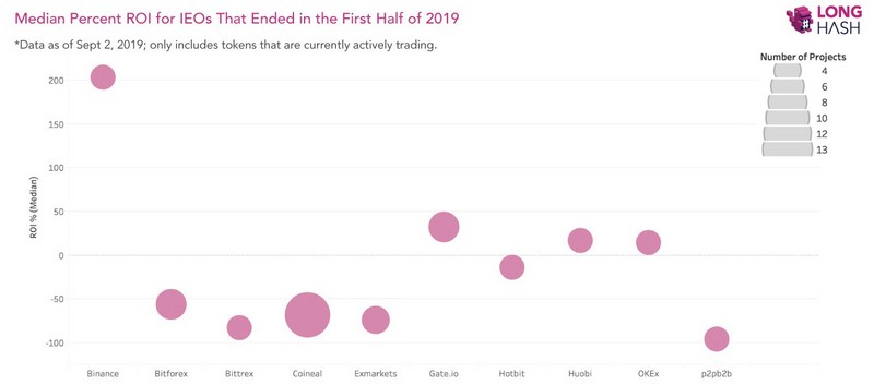 5 .9月6日,除少数主流交易所外,2019年IEO项目回报率相当糟糕。Longhash发文称,在Coincodex上发现77个IEO项目,其中有三分之二代币的价格低于投资者在IEO时支付的成本。在2019年至少完成四个IEO的交易所中,币安表现最好,Gate、火币、币安和OKEx都呈现正投资回报。