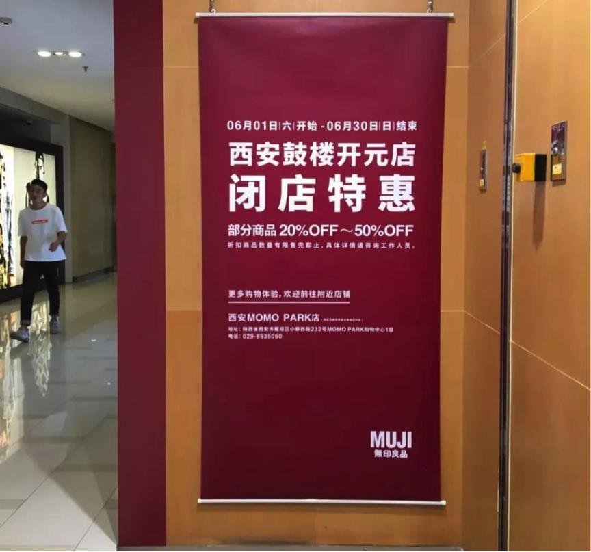 MUJI在西安的首店(钟楼开元)店,发布一张告示“闭店特惠”,宣布在6月结束开元店的运营,并推荐购物者到位于地铁吉祥村站的MOMOPARK的店铺购物。
