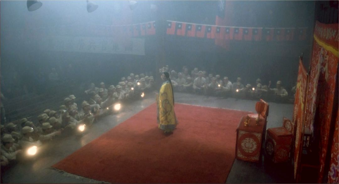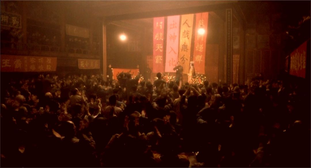 戏台上所有的戏具都被撤离,摆上会议大长桌,挂上白底黑字的长横幅。二楼非富即贵的雅座,是没有人屑于去坐的。暗沉的蓝布挂满四周,预示着戏台主角程蝶衣与段小楼接下来的惨淡命运。