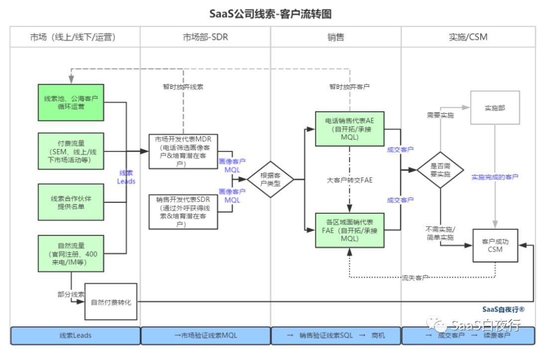 线索Leads——市场验证的线索MQL——销售验证的线索SQL——商机(一般toB公司商机要分5~7个阶段)——成交客户——续费客户(进入稳定期)。