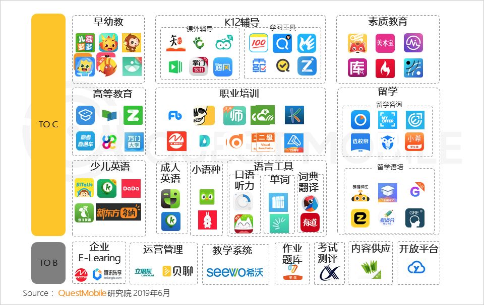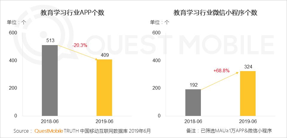 言归正传,今天跟大家分享一下在线教育发展状况。QuestMobile数据显示,当前整个在线教育产业链相当完整,to C端贯穿用户全生命周期,to B端覆盖平台、校园、教学管理系统,总体用户量也已经突破4.8亿,呈现见顶态势。不只用户,APP个数也是,从2018年6月的513个下降至2019年6月的409个,跌了20.3%;倒是学习类微信小程序仍在增长,由192个增加到324个。