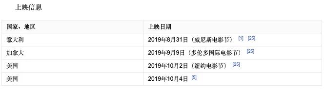 直到2019年8月31日在威尼斯电影节上首映之后,影片口碑在网络上彻底爆炸。据说首映结束之后,现场集体起立鼓掌了数分钟左右,媒体将其形容为堪比《蝙蝠侠:黑暗骑士》的神作。