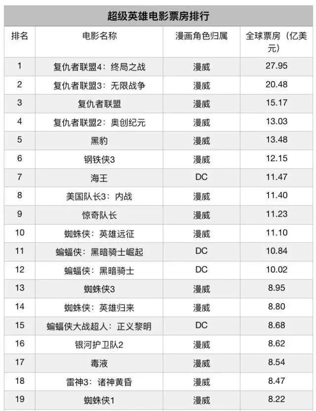 在超英电影全球票房top19中,DC只有《蝙蝠侠》系列《海王》《超蝙》等部4影片上榜,漫威则包揽了前6,其中《复联4》以27.95亿美元问鼎全球票房冠军。