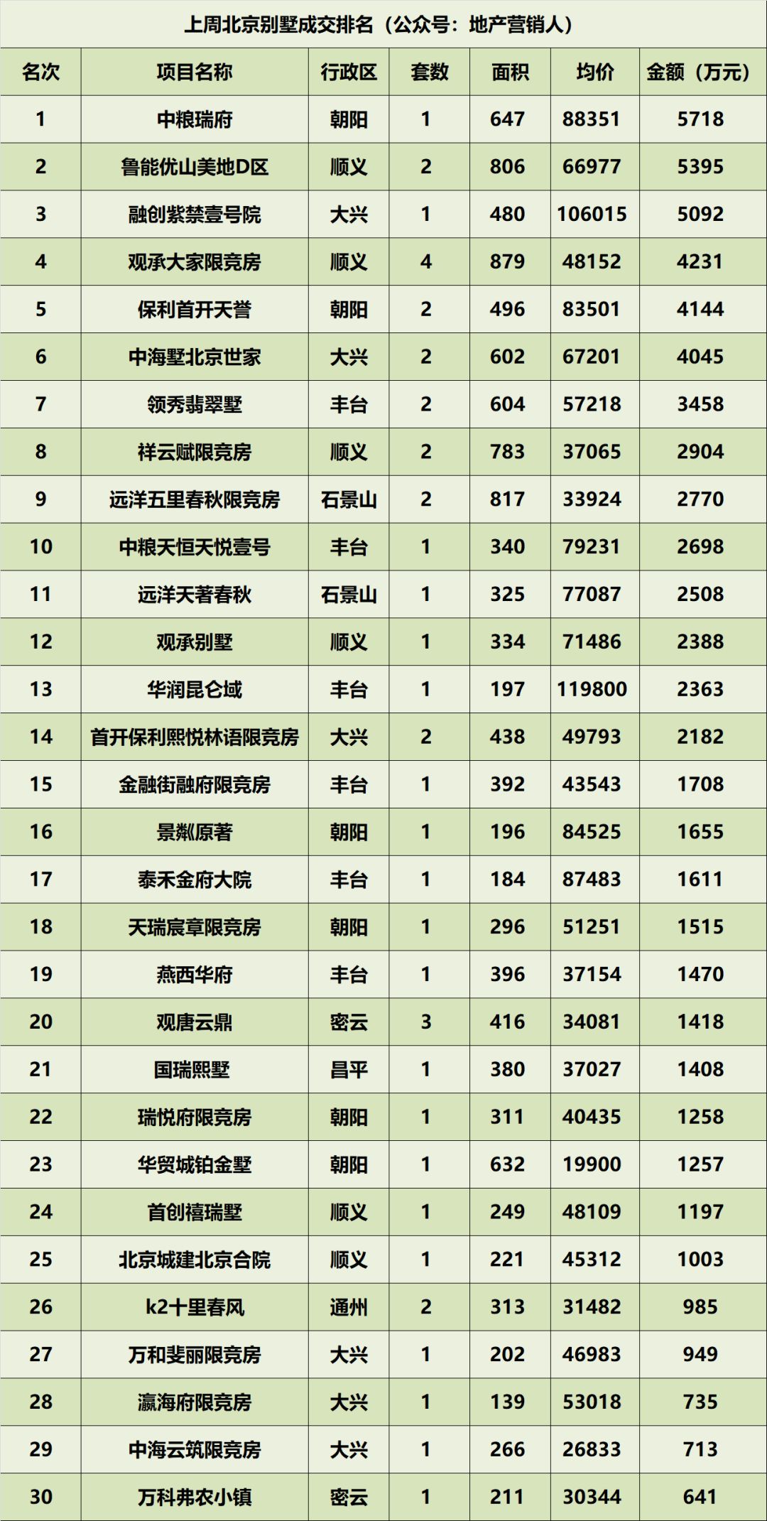 别墅市场成交48套,成交面积1.34万㎡,成交均价53241元/㎡,成交金额7.11亿元,成交排名明细如下: