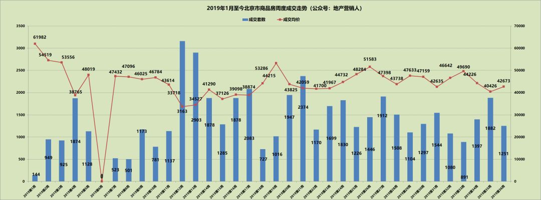 2019年9月2日—9月8日,北京市商品房成交1251套,环比下降34%;成交面积15.28万㎡,环比下降36%;成交均价42673元/㎡,环比上涨6%;成交金额65.22亿元,环比下降32%。