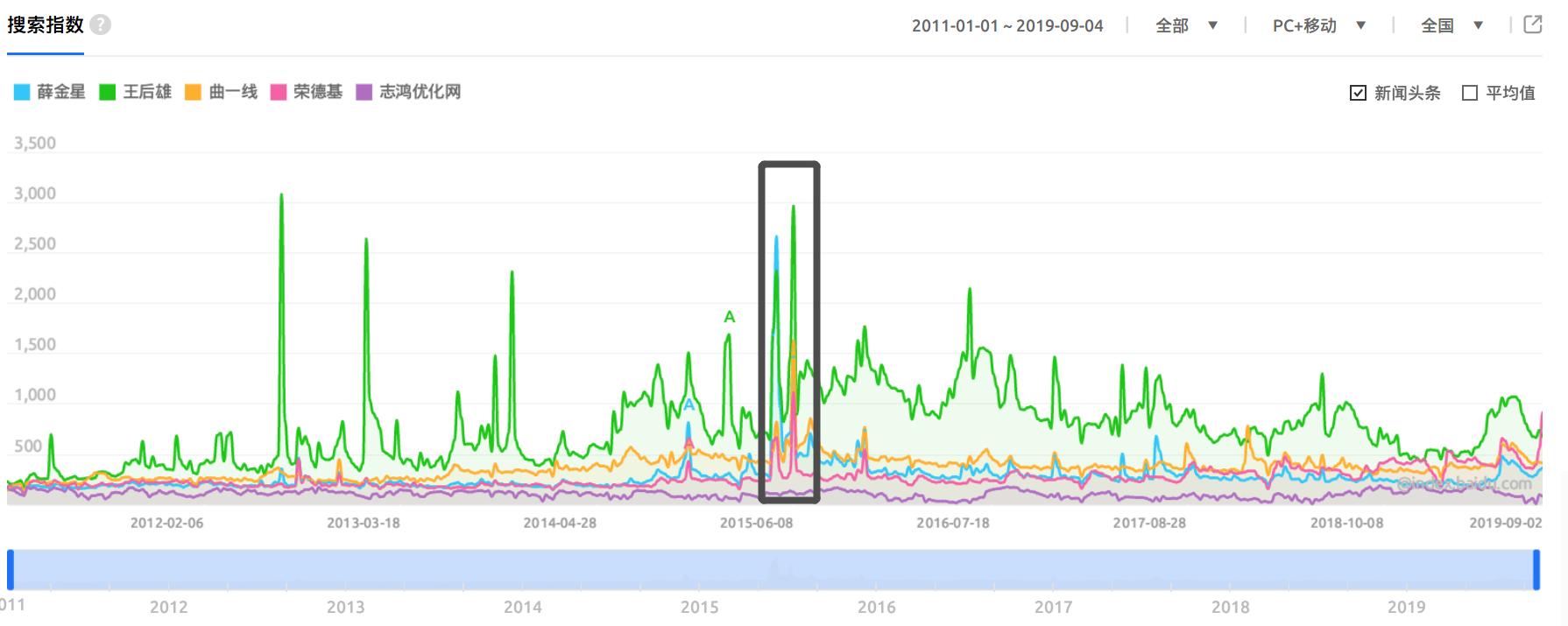 百度指数显示,2011年至今,王后雄的搜索热度优势明显,仅在2015年5月份被薛金星短暂超过。曲一线、荣德基和薛金星三者之间的差距并不明显,志鸿优化网的搜索热度垫底。