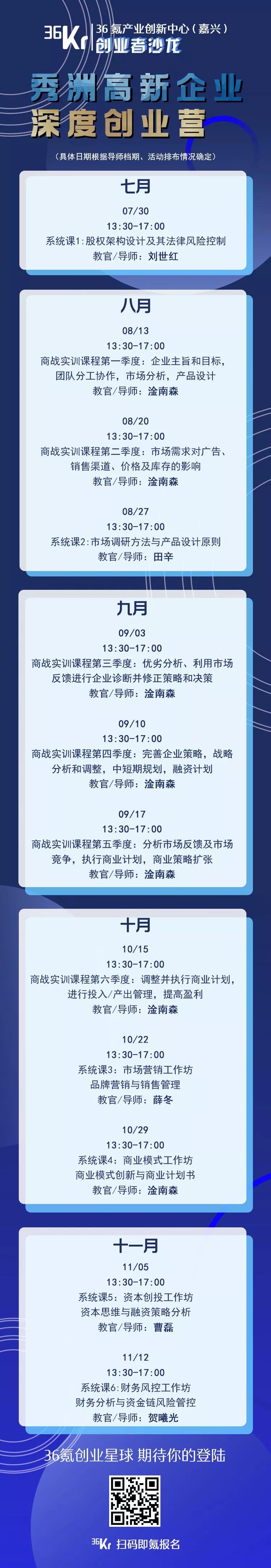 机会来啦!36氪浙江出资数十万打造的CEO自我成长的完美课程【秀洲高新企业——深度创业营】,免费送给创业者!活动详情如下,速速扫码报名参加吧!
