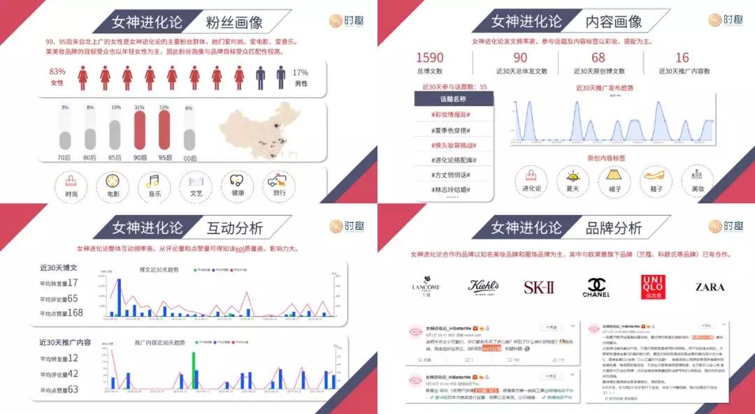 通过对第一次筛选下来的KOL与该美妆品牌具体产品特性二次分析,从粉丝画像、内容画像、互动分析、品牌分析四个维度,进一步计算与该品牌的匹配值,最终筛选出约420个高度匹配的KOL清单。