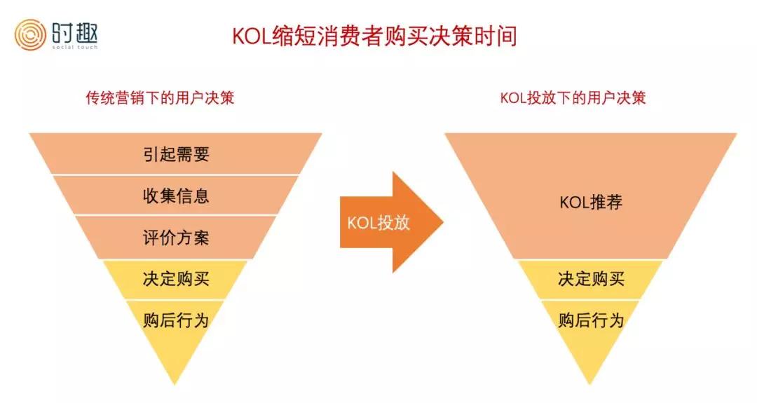 在复杂购买行为中,《消费者行为学》把消费者购买决策分解为引起需要、收集信息、评价方案、决定购买、购后行为五个阶段,而在KOL的营销过程中,KOL能够帮助用户挖掘自身需求、收集商品信息、进行方案评价,直接引发用户购买,缩短了用户行为链条。