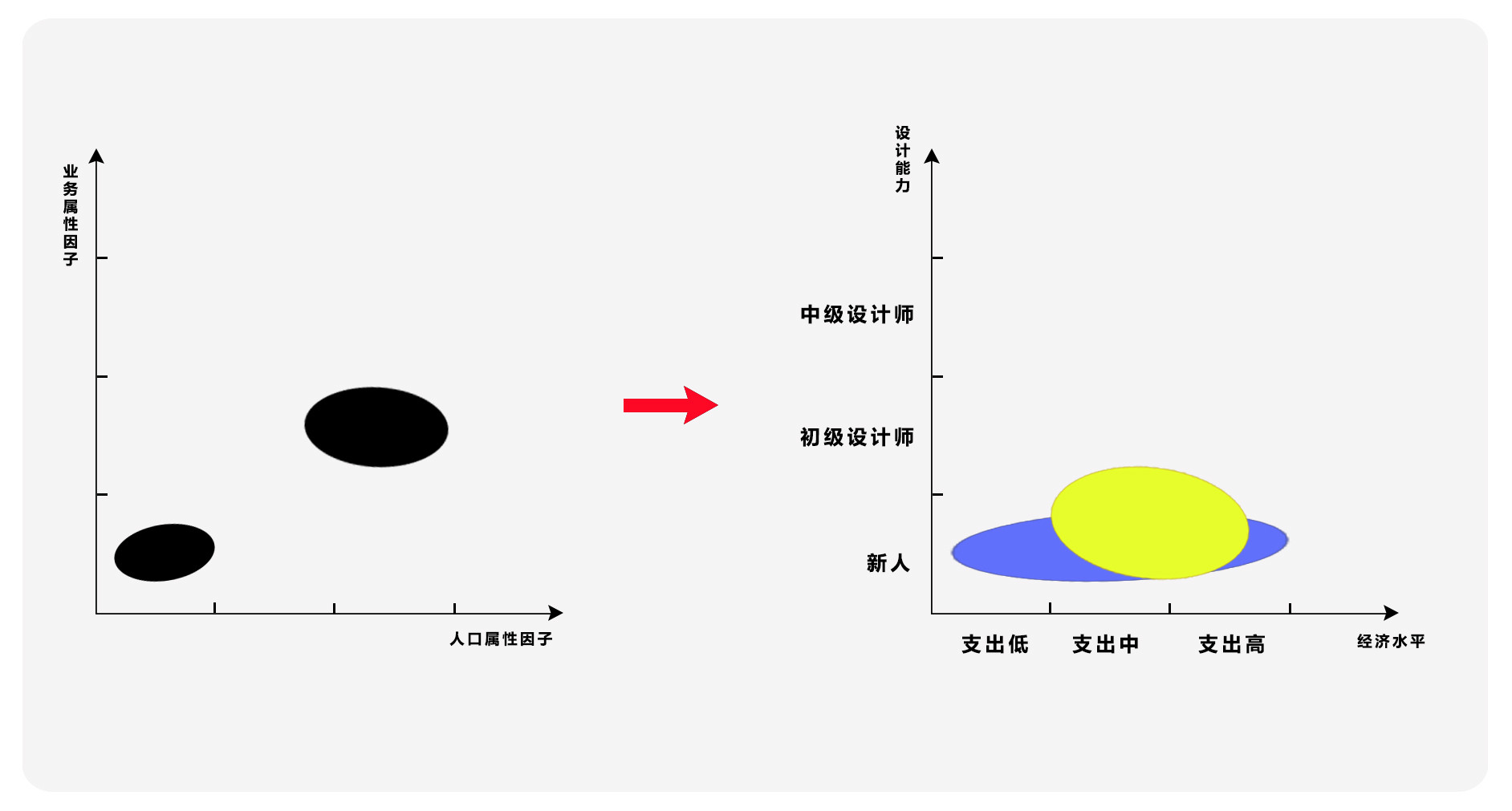 在设计师的行业属性中关键因子是设计水平,可划分为新人、初级设计师、中级设计;对于课程推广中关键人口属性是用户经济水平,不同经济水平能支付的课程费用是不同的。当然不同水平的设计师需求也是不同的,新人更多的是入门和进阶到初级设计师,初级设计师希望的是提升自己的业务输出能力。