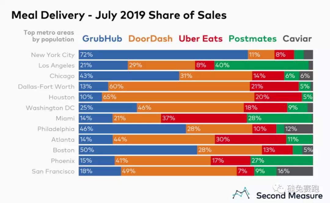 GrubHub在东北区如纽约和波士顿最受欢迎,而DoorDash在德州遥遥领先,Postmates则在洛杉矶当仁不让的占据了40%的市场。