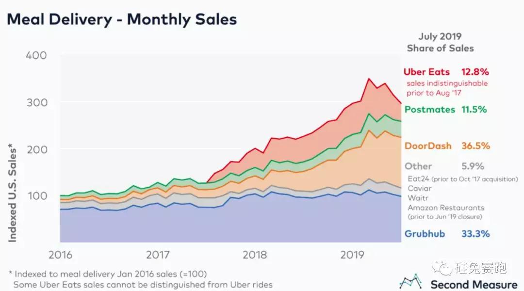 根据Second Measure最新数据,今年7月,DoorDash目前处于领先位置,占据了36.5%的市场,而GrubHub紧跟其后,拥有33.3%的市场。