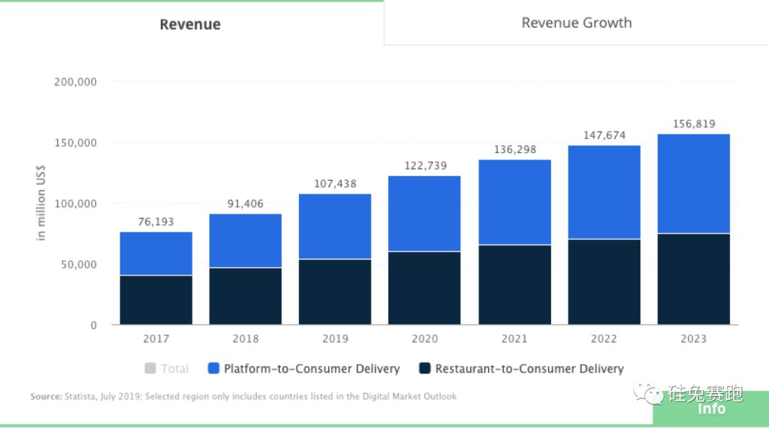 根据Statista的报告来看,美国的食品外卖市场仍有着巨大的潜力,整体收入将从2018年的91亿美元增长到2023年的156亿美元。