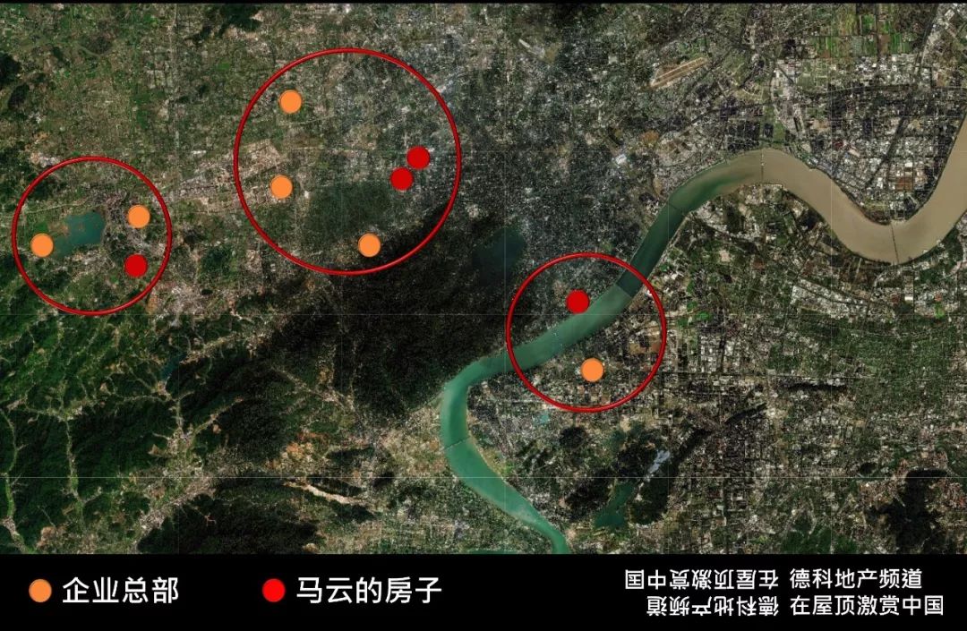 再回味一下这张地图,红色的圆点是马云买的房子,橙色的圆点是阿里系企业的总部——