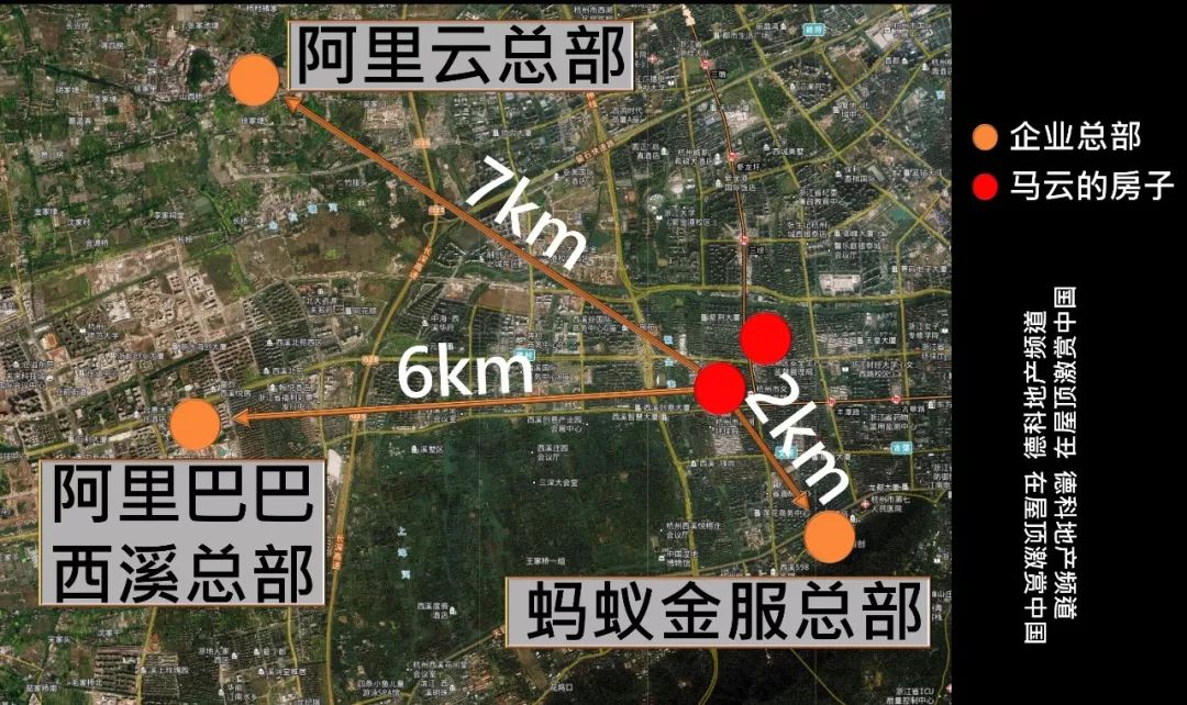 我们把马云买的四套住宅和阿里系企业总部(阿里巴巴总部、蚂蚁金服总部、阿里云总部、菜鸟总部、达摩院),放在地图上,就可以看得恍然大悟了——