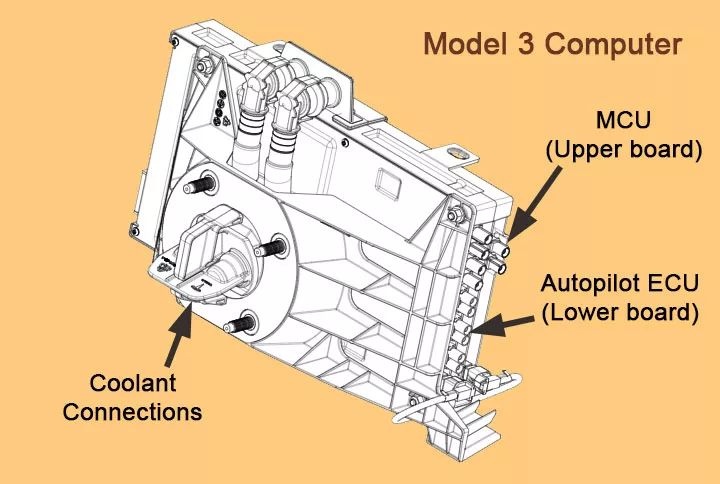 在Model 3中,特斯拉将MCU与Autopilot ECU两个板子分为两层装进了同一个外壳中(如下图),使得原本娱乐域和自动驾驶域的两个零部件就像左脑和右脑的关系一样,物理上组合在一起形成了一个车载大脑零部件。