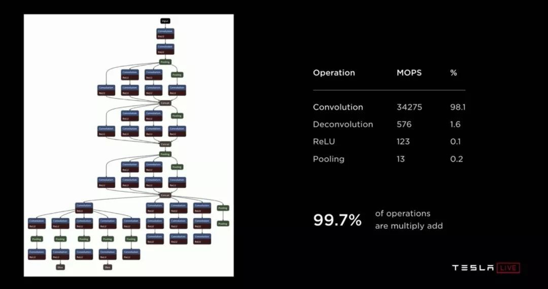 特斯拉分析,应用一个典型的使用CNN 卷积神经网络的视觉感知算法,其中99%以上的计算操作为加法与乘法运算(如下图)。NPU通过提供特定矩阵运算硬件加速指令(DMA读写,卷积/反卷积,点乘等)并将模型加载进NPU的SRAM,可以较大的优化神经网络模型应用,达到原先使用通用的GPU处理器运算速度的21倍(在解决特定问题上)。