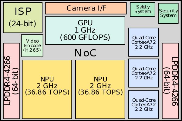 FSD芯片采用三星的14nm技术制造,如下图,一个SOC中集成了:3个4核(共12核)ARM Cotex-A72架构的2.2GHz的CPU,一个1GHz的GPU,两个2GHz的NNP(神经网络处理器)。每个NNP有个96*96个MAC的矩阵,32MB SRAM,每个NNP的处理能力是 96*96*2(OPs)*2(GHz)=36.864TOPS,则单个芯片为72 TOPS,包含两个芯片的Autopilot ECU为144TOPS。