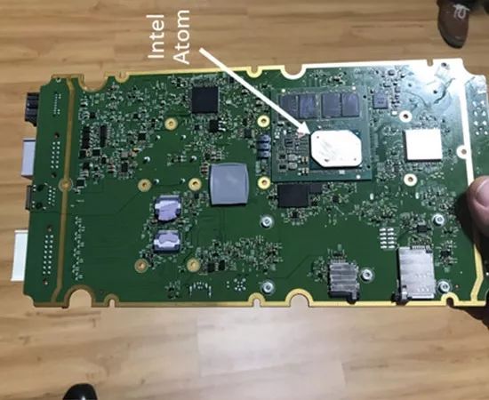 如上图,其中上层的板子为媒体控制器,使用Intel Atom E3950的4核2.0Ghz的x86架构处理器,运行特斯拉基于Linux开发的操作系统负责中控大屏的信息娱乐功能(特斯拉尚未根据GPL开源协议将Model 3该部分Linux修改代码开源)。