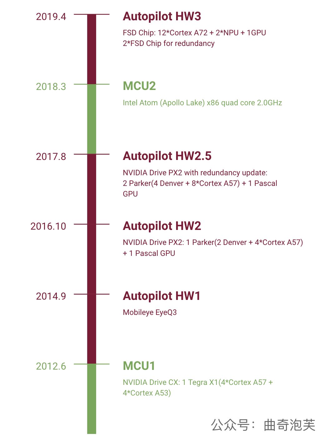 特斯拉于去年3月份发布了基于Intel Atom(Apollo Lake)芯片的新版本多媒体控制器MCU2(MCU, Media Controller Unit),今年4月份发布了其自研SOC(System On Chip)的Autopilot硬件HW3(FSD,Full Self Driving)以支持将来实现全自动驾驶所需要的算力。多媒体控制器MCU与Autopilot ECU共同构成了特斯拉的大脑,最新版本的两个硬件开始在今年4月份下旬生产的Model 3和5月下旬生产的Model S/X中使用。