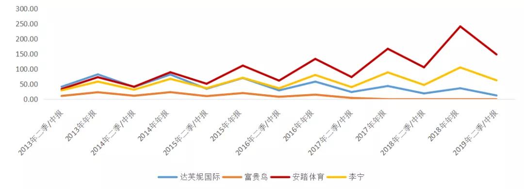 两家休闲鞋(富贵鸟、达芙妮)以及两家运动鞋品牌(安踏、李宁)营业收入