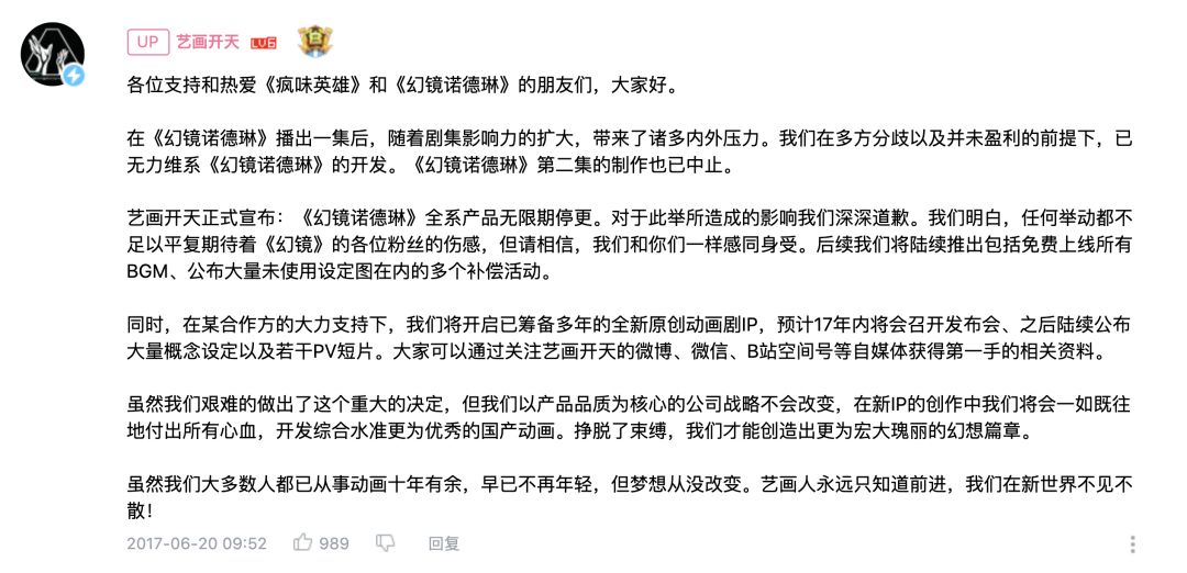 宣布停更后,艺画开天在全网撤下了《疯味英雄》和《幻镜诺德琳》仅有的第一集,同时宣布公司将全力转向原创 IP 的开发。有人说这是艺画开天彻底撇开过去、重新开始的信号,但无论对阮瑞个人还是对整个团队而言,撇开过去都是一件非常痛苦的事。