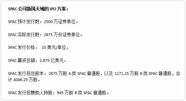 在以SPAC方式上市前,SPAC赞助人、SPAC管理层股东、SPAC管理层持股平台获得的股份为B类SPAC普通股。SPAC公司新风天域在SPAC上市中的股份为A类SPAC普通股。