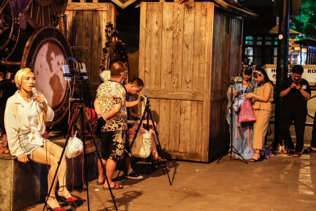 一位60出头的老阿姨穿着圣诞老人的红上衣,对着镜头,随着土酷的乡村重金属音乐《鳌拜鳌拜》,放肆舞蹈。只要不下雨,她每晚都会出现。方圆500米内,起码还有20台手机正在直播,不少穿着汉服的男孩女孩在拍摄段子。