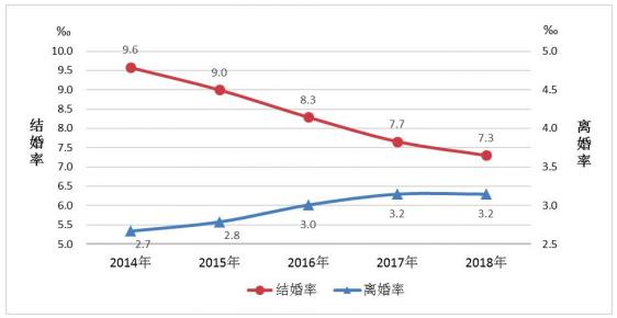 在最新发布的《2018年民政事业发展统计公报》中显示:2018年我国离婚率持续走高达到3.2%,结婚率持续走低仅有不到8%;