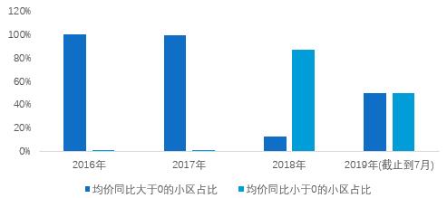 在2016和2017年房地产市场较好时,北京基本上所有小区都在同步上涨,均价上涨的小区占比达到99%。2018年在调控影响下,87% 的小区转为下降。经历过两年多的调控后,市场进入上行力量和下行力量势均力敌的拉锯战中。今年前7月,价格同比上涨和下跌的小区各占一半。