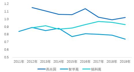 图:燕尚园、智学苑和铭科苑房价分别与商圈西二旗房价比值的变化