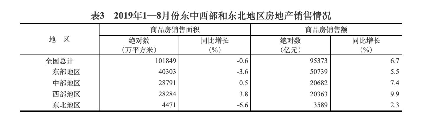 相比于前7个月,8月房地产销售情况提升乏力。统计局数据显示,1—8月份,商品房销售面积101849万平方米,同比下降0.6%,降幅比1—7月份收窄0.7个百分点。值得关注的是,东部和东北部区域依然是降温重点,1—8月份,东部和东北部地区商品房销售面积同比下降3.6%和6.6% 。