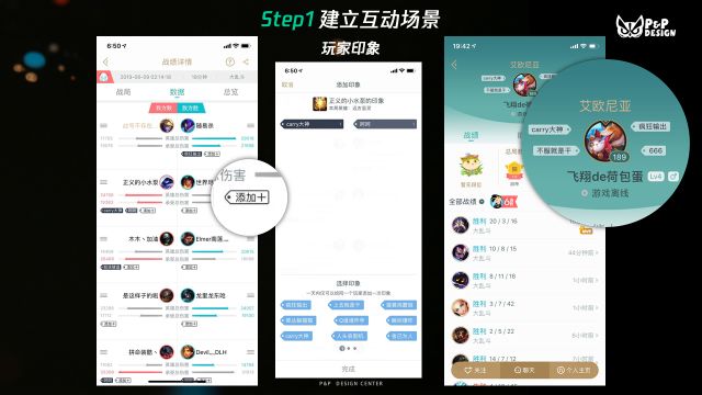 玩家印象这个功能的具体呈现经过了很多个版本的迭代,上图呈现的是最新的战绩列表。每一次对局后,玩家就可以在池子里面挑选他想对某个玩家打的标签,比如人头收割机、carry大神等等,当然也有些吐槽用的标签。最终,这些标签会会沉淀在三玩家的个人主页上。