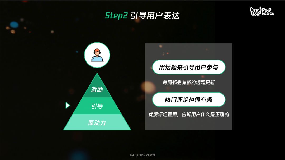 将互动场景都挖掘好后,设计师所要做的第二件事是引导用户表达。这里做了2件事,第一是运营侧会每周更新有趣的话题,引导玩家来参与。第二件事情是,把热门的评论置顶,告诉用户发什么样的留言是正确的、受欢迎的。