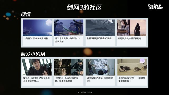 也是从线上和线下社区来看,有包罗万象的官方论坛,也有查看资讯、联系好友、查看战绩的剑网3推栏app。《剑网3》团队有一个非常有趣的文化建设,定期会发布研发小剧场,无形间拉近了团队与玩家之间的距离。另外也有线下社区的载体,除了粉丝产出的同人歌曲,COSPLAY等形式,官网也陆续推出了同人动画,以及粤剧《决战天策府》和舞台剧《剑网3·曲云传》,以传统戏曲的表现形式来承载游戏文化。