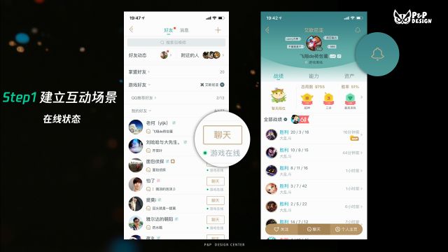 所以,关于在线状态的查看,团队希望将这一功能的展示做到方便快捷,最终选择将其沉淀在关系链列表里面。如果玩家想要特别关注某一个人,你可以在他的个人主页中点击右上角的小铃铛按钮。一旦玩家上线,系统就会给你推送通知。而查看在线状态的功能在上线后也被玩家调侃为查岗神器,可以随时用来看一下男朋友有没有在玩游戏。
