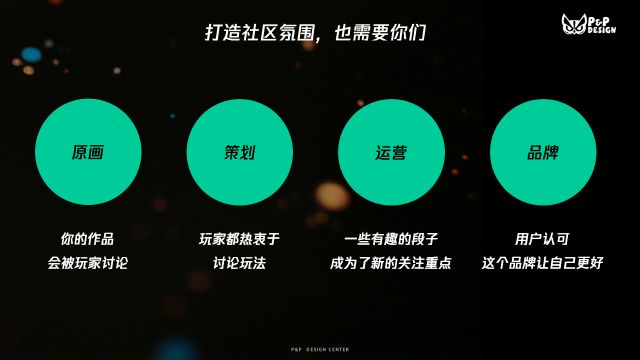 第二个思考,在文章中,笔者聊的是从设计的角度来帮助打造游戏社区的内容与氛围,那么其他岗位上的小伙伴是否也可以参与到社区的经营之中来呢?上图是笔者自己的一些发散思考,希望能够抛砖引玉,带给你一些启发。