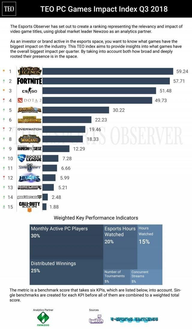 在2018年的第三季度,国外媒体The Esports Observer发布了一则统计:截止至2018年Q3为止,《英雄联盟》仍然是全世界最具影响力的游戏,没有之一。