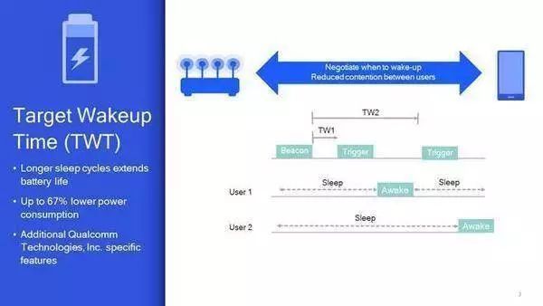 WiFi 6 还加入了 Target Wake Time 目标唤醒时间机制(TWT),这项技术主要面对时下流行的智能设备,通过减少智能家居的通信频率,并调节链接时长来控制能耗,节约电量。