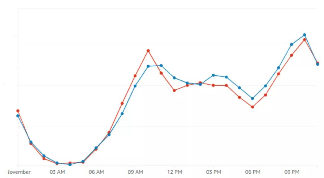 移动端(红) vs PC端(蓝)的分时流量趋势