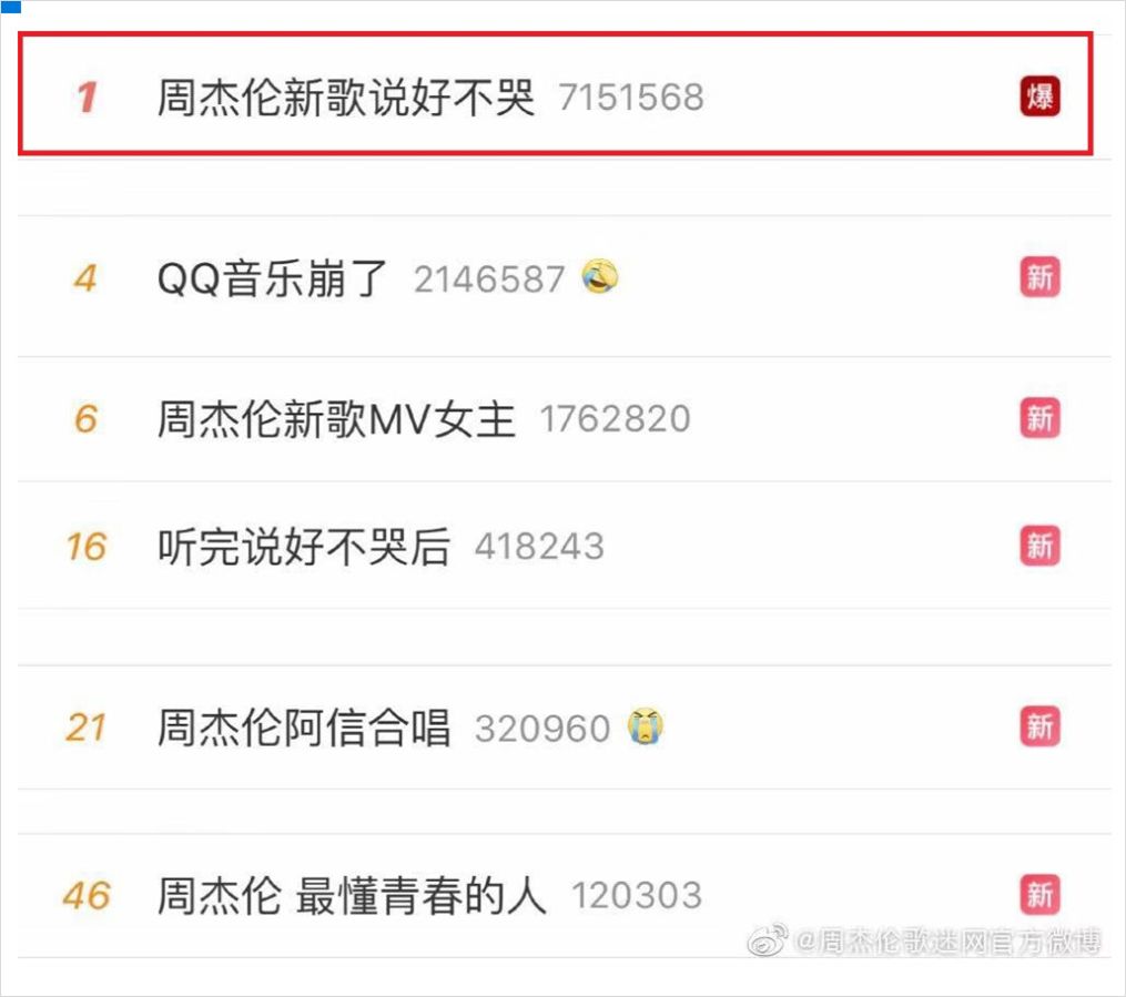 在如此疯狂的歌迷支持下,微博热搜话题 #周杰伦新歌说好不哭# 以“爆”登顶……
