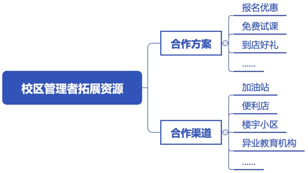 校区管理者可以通过更多周边资源来扩展招生面,可以先定义一些渠道合作方案,比如:报名优惠,免费试课,到店好礼等活动与渠道合作商分成。这里合作可以有多样性选择,可以是加油站、可以是便利店、楼宇小区、小学校周边广告位、也可以是其它异业的教育机构。一切以扩大宣传自有招生面积为核心都可以去谈合作,那么也一样渠道需要记录渠道的来源,设计好分成方案,方案中要体现回报价值。