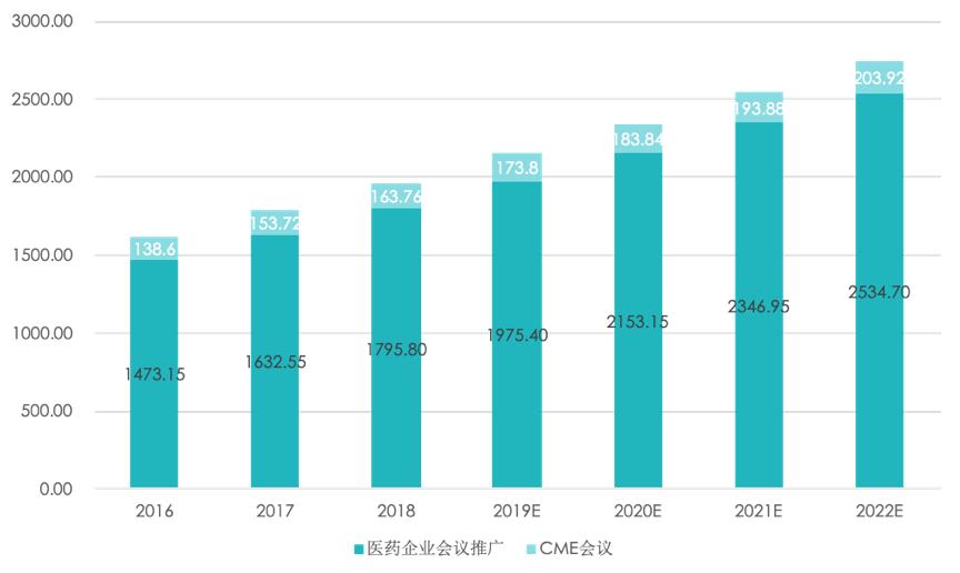 而此外,还有很多由药企支持举办的医学论坛、推广会议等活动。根据行业访谈,一般大型药企每年在会议方面花费的费用约占销售额的5%-10%。按照保守估计5%计算,结合国家产业局给出的我国医药企业整体销售数据,可以发现2018年医药企业在会议推广上上的花费已达1700亿元,加上CME的份额,则整体市场规模近2000亿元。