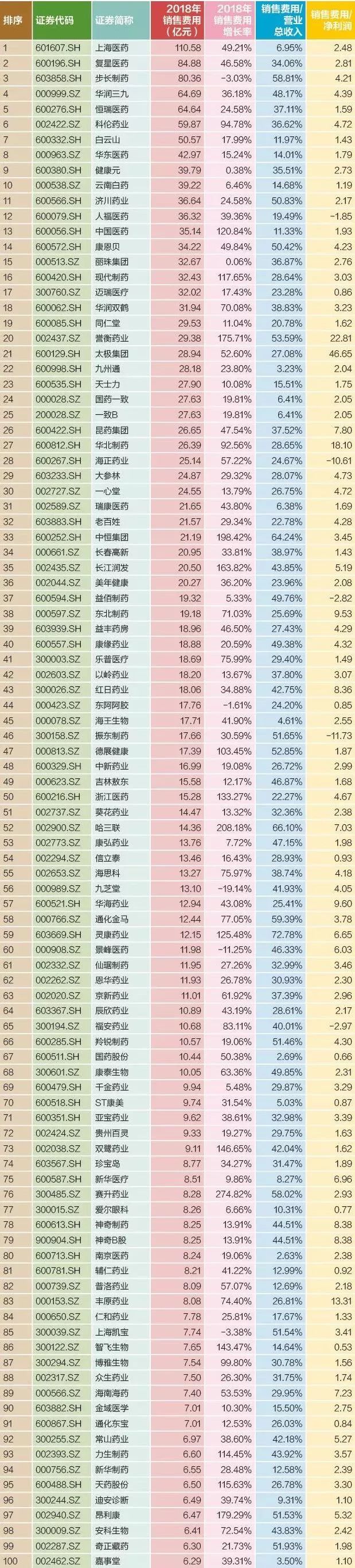 销售费用的增速,的确快得出乎意料。而这299家上市企业2018年的整体销售费用已超过2500亿元,其中销售费用排名前5的医药企业合计销售费用高达405.15亿元,而这5家公司,也恰恰在抽查名单中。