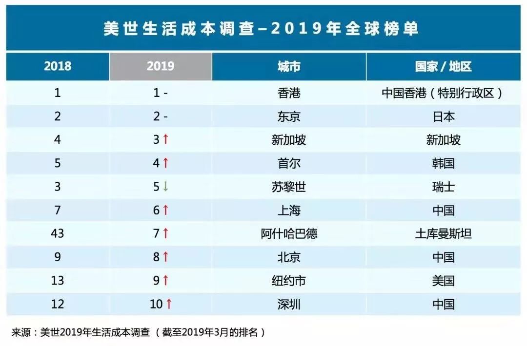 美世2019年刚刚出炉的城市生活成本调研中,全球居住成本排在前十的十个城市里,有四个是中国的,其中三个在中国大陆。