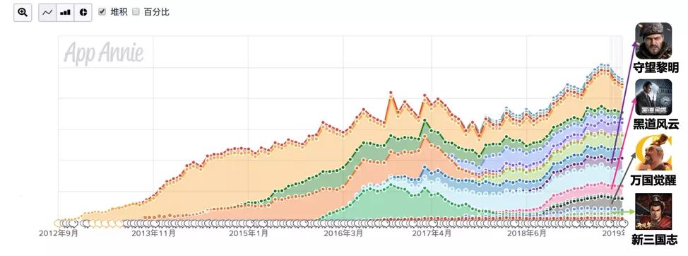 数据来源: App Annie Intelligence, 主流SLG游戏近年大盘收入趋势,iOS + Google Play合计