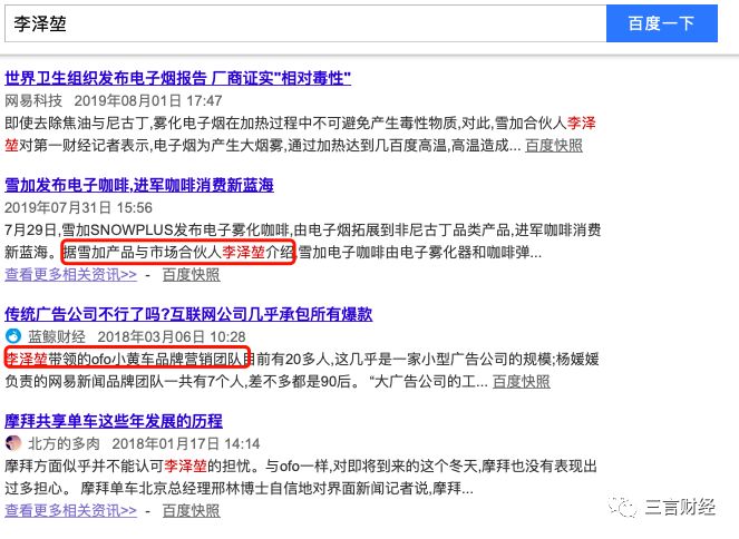 此外,在2018年还以ofo品牌负责人出现的李泽堃,到了今年身份则变成了电子烟品牌“雪加”的联合创始人。