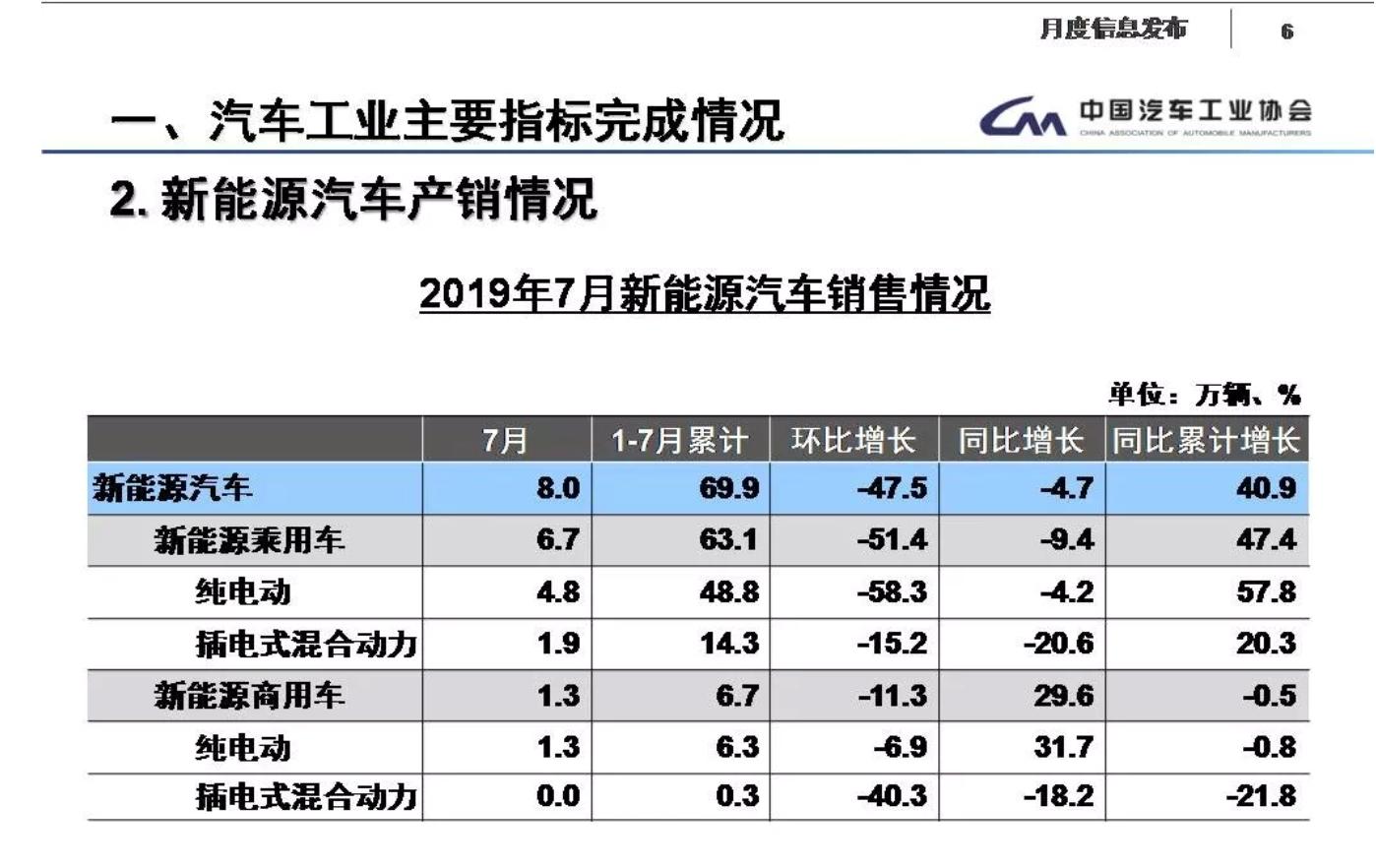 中国汽车工业协会的数据称,今年7月,我国新能源汽车销量罕见地出现了负增长,只卖出了8万辆,环比下降47.5%,同比下降4.7%。其中,新能源乘用车销量为6万辆,环比下降12.5%,同比下降12.9%;纯电动乘用车销量4.8万辆,环比下降58.3%,同比下降4.2%。