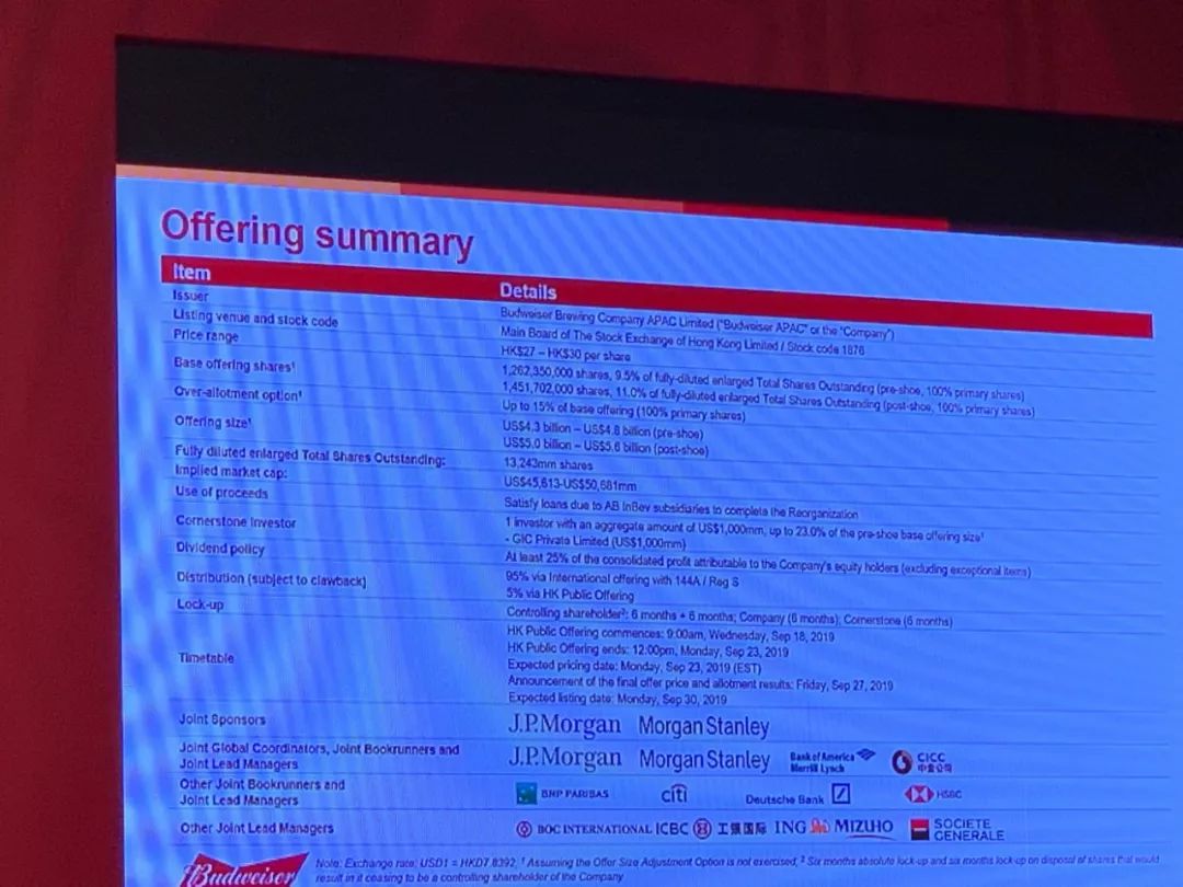 按照百威亚太昨日公布的计划,共计发行12.62亿股股票,其中95%为国际配售,5%作公开发售;按发行价上限计算,此次募资额至多约为379亿港元(约48.5亿美元)。