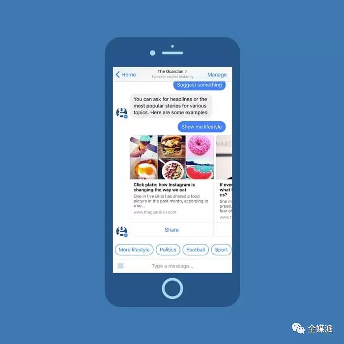 《卫报》推出了适用于Facebook入口的聊天机器人,能够有效节省读者浏览和搜索新闻的时间。启动该聊天机器人后,后台将自动在每天早上通过Facebook Messenger向读者推送精选的新闻报道,可选时间有6、7、8点三种。